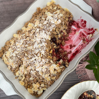 Valmistamiseks vajad: 1 pakk Pakipagari gluteenivaba täisterakaerahelbeküpsiste küpsetussegu 400 g musti sõstraid 60 g võid 1 sl tuhksuhkrut 1 sl kartulitärklist 4 sl mandlilaaste 1,5 tl kaneeli Serveerimiseks vaniljejäätist